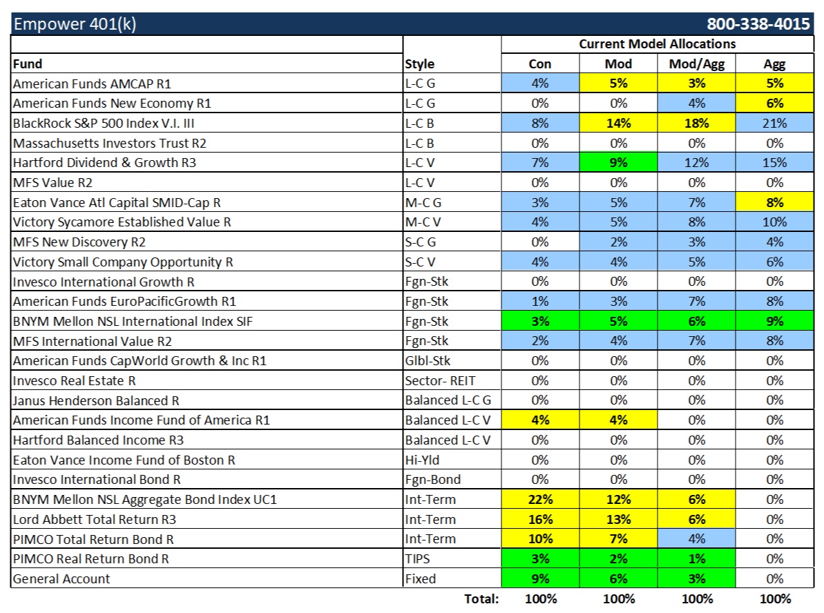 Model Portfolio Holdings are Investment Options we recommend you use for exposure to specific asset classes within your 401(k) plan, and are reviewed on a regular basis. See Investor Note below. Our Model Allocations are risk-based and well-diversified for your long-term investment objectives. To Check your Risk Tolerance, download and complete the Allocation Questionnaire. Our Model Allocations are Not Guaranteed, will fluctuate in value, and there is risk of loss, particularly in the short-term. Model Allocations are only suggestions and participants are not required to follow them. All 401(k) participants are in full control of what investment options they want to invest in for their retirement future. Email your Nelson Representative above for a Review and/or ask questions.