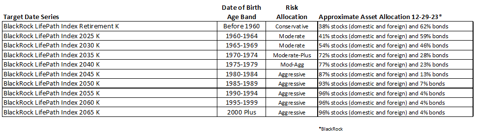 Target Date Funds are the Qualified Default Investment Arrangement (QDIA) option in your 401(k) plan. Target Date Funds are diversified risk-based portfolios that will automatically reduce risk as you approach your Target Retirement Date, assumed to be age 65. The further away from your Target Retirement Date, the more aggressive (higher stock exposure) the fund will be. And the closer to your Target Retirement Date. the more conservative (higher bond exposure) the fund will become. Target Date Funds are Not Guaranteed, will fluctuate in value, and there is risk of loss, particularly in the short-term.