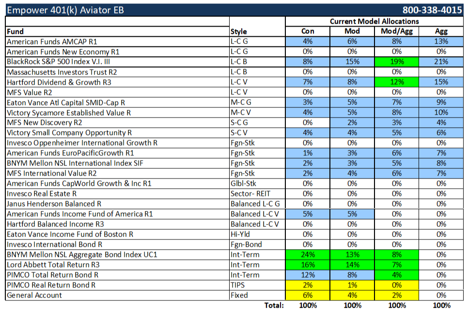 Model Portfolio Holdings are Investment Options we recommend you use for exposure to specific asset classes within your 401(k) plan, and are reviewed on a regular basis. See Investor Note below. Our Model Allocations are risk-based and well-diversified for your long-term investment objectives. To Check your Risk Tolerance, download and complete the Allocation Questionnaire. Our Model Allocations are Not Guaranteed, will fluctuate in value, and there is risk of loss, particularly in the short-term. Model Allocations are only suggestions and participants are not required to follow them. All 401(k) participants are in full control of what investment options they want to invest in for their retirement future. Email your Nelson Representative above for a Review and/or ask questions.