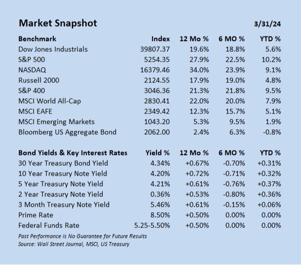 The mid-cap S&P 400 jumped 9.5% in Q1, while the tech-heavy Nasdaq gained 9.1%, and each set multiple record highs during the quarter. Although the Dow lagged with a 5.6% gain, it did set multiple record highs in Q1 including closing above 39,000 for the first time ever. The small-cap Russell 2000 also lagged in Q1, posting a solid gain of 4.8%, but showed the broad-based nature of the First Quarter.