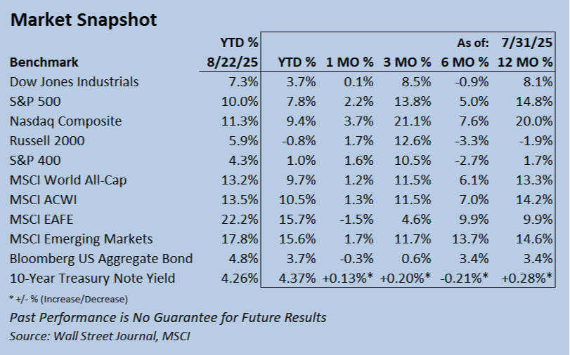 We've continued to witness a swift and robust recovery from April’s tariff-induced lows and further imbeds the importance of discipline and diversification for investors. As noted above, Fed Chair Powell's Jackson Hole comments on August 22 sparked a global market rally on raised optimism of a 0.25% policy rate cut at the Fed's September FOMC meeting. Yet, economic data between now and then will weigh on the decision. Market valuations, mixed economic data, continued global trade tensions and geopolitical risks mean volatility is likely to persist.