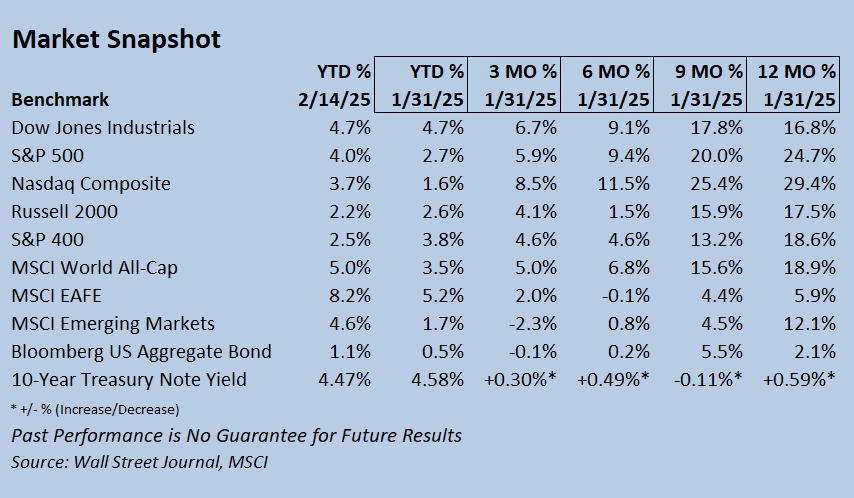 The benchmark S&P 500 and tech-heavy Nasdaq outpaced the Dow, small-caps, and mid-caps to begin February, as the latter moderated, and large-cap growth stocks rallied. As of February 14, the Dow Jones Industrials remain the US leader for 2025 with a 4.7% gain; however, the S&P 500 and Nasdaq have closed the gap with YTD gains of 4.0% and 3.7%, respectively. Foreign markets have continued their strong start, with the benchmark MSCI EAFE index gaining an additional 2.9% in February to extend its leading YTD returns to 8.2%. MSCI Emerging Markets have jumped 2.9% in February, raising their YTD gains to 4.6%.