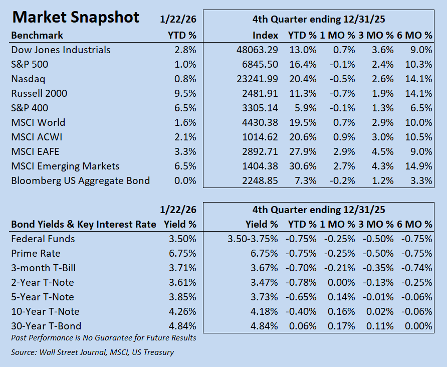 While the Dow led U.S. indexes in the fourth quarter with a 3.6% gain, it was the technology-heavy Nasdaq that outpaced all U.S. benchmarks for the year, rising 20.4%, as artificial intelligence remained a dominant investment theme. Importantly, market leadership broadened meaningfully beyond the “Magnificent Seven,” an encouraging sign that reflected a resilient economy and improving participation across sectors and market capitalization. Corporate earnings growth for 2025 is expected to land in the 10%–12% range, helping support elevated equity valuations.