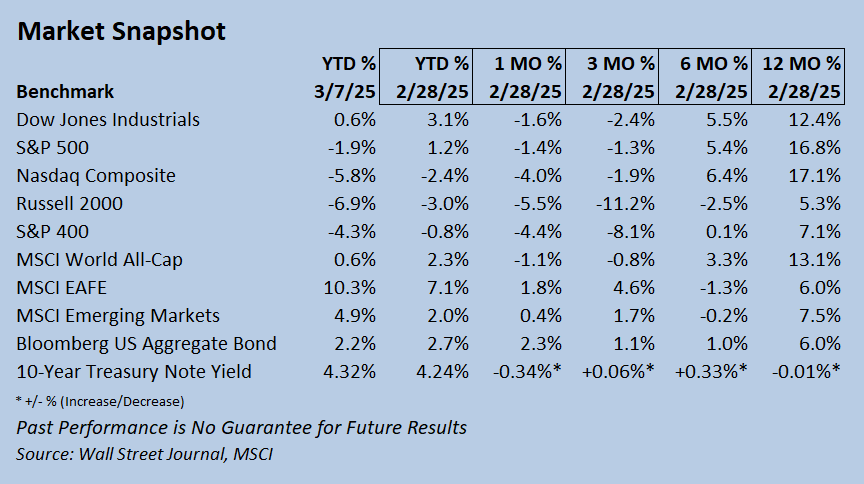 Market turbulence continued into early March as February’s key concerns remained unresolved, pushing major U.S. indexes further into negative territory year-to-date—except for the Dow, which has stayed resilient since January’s choppy start.