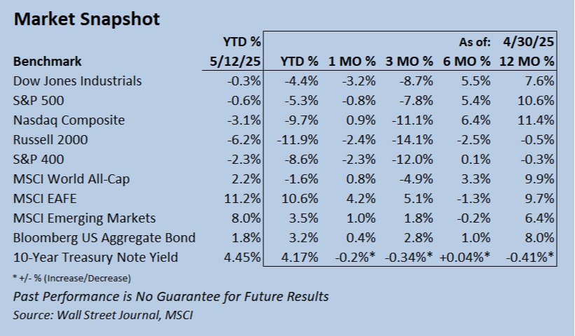 Breaking News (5/12/25): Over Mother’s Day weekend, Treasury Secretary Bessent met with China trade representatives in Geneva and mutually agreed to temporarily lower reciprocal tariffs from unsustainable levels, while further details are worked out. The de-escalation was welcomed news and markets surged across the board today on the news, led by tech-heavy Nasdaq +4.8%, small-cap Russell 2000 +4.4%, mid-cap S&P 400 4.2%, and the benchmark S&P 500 +3.4%, while the Dow jumped 1191 points, or 2.9%.