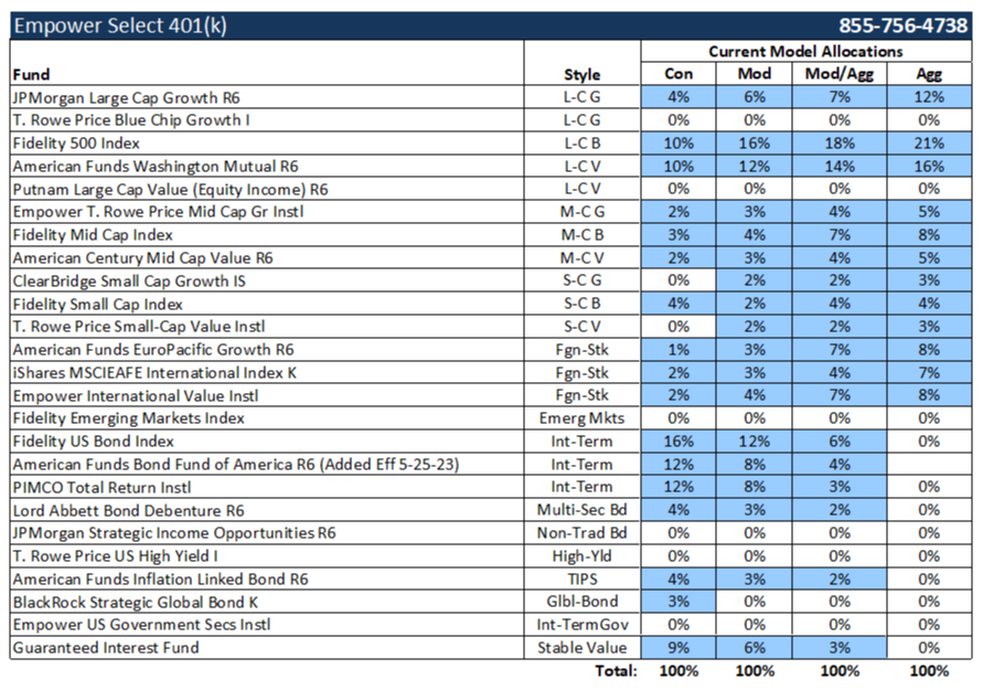 Model Portfolio Holdings are Investment Options we recommend you use for exposure to specific asset classes within your 401(k) plan, and are reviewed on a regular basis. See Investor Note below. Our Model Allocations are risk-based and well-diversified for your long-term investment objectives. To Check your Risk Tolerance, download and complete the Allocation Questionnaire. Our Model Allocations are Not Guaranteed, will fluctuate in value, and there is risk of loss, particularly in the short-term. Model Allocations are only suggestions and participants are not required to follow them. All 401(k) participants are in full control of what investment options they want to invest in for their retirement future. Email your Nelson Representative above for a Review and/or ask questions.